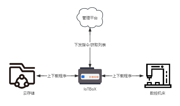 DNC功能用于将机床的程序与云端打通,实现远程程序管理,实现此功能需要将三个地方的程序同步,云端、IoTBoX与机床,IoTBoX用于在云端和机床间中转程序,某种应用场景也需要IoTBoX作为存储载体直接向机床提供服务