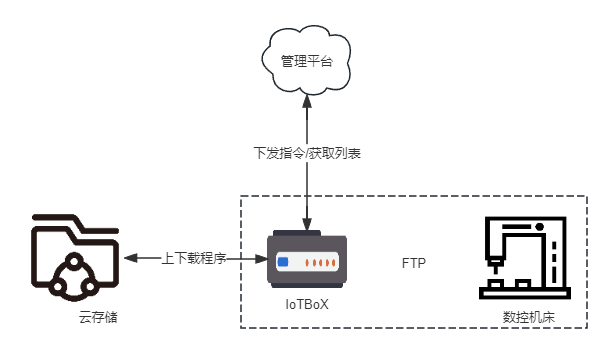 FTP模式通过外部指令操作IoTBoX,从云存储下载程序或上传程序到云存储,机床通过FTP挂载IoTBoX目录,加工时直接读取IoTBoX内程序